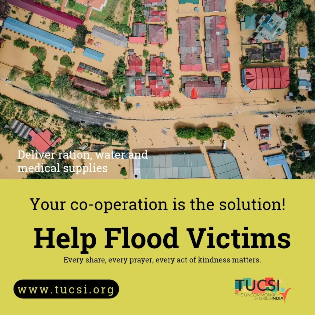 Torrential rains have devastated entire communities, submerging homes, destroying livelihoods and leaving thousands of families without food, clean water or medical care. Children, the elderly and the most vulnerable are facing unimaginable hardship. TUCSI – The Uncommon Stories of India – has launched an urgent relief mission to deliver ration, safe drinking water and essential medical supplies to flood-affected areas.